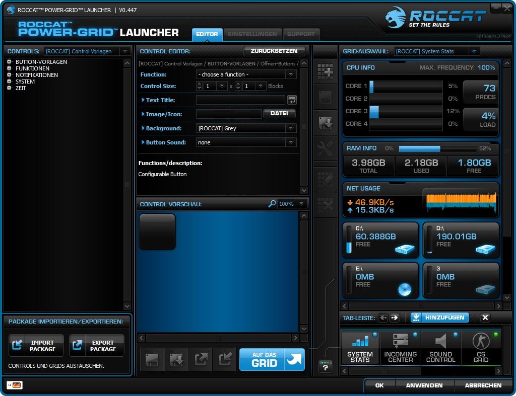 Mit der Power-Grid App arbeitet Roccat wahrlich an etwas Innovativem und bislang noch nicht Dagewesenem. Die geschlossene Betaphase läuft schließlich schon über ein Jahr und wird mit vielen Menschen, dank eines dafür separat angelegten Feedback Forums, immer weiter entwickelt und verbessert. In Zusammenarbeit mit den bereits angesprochenen Produkten wird sich der Nutz- und Spaßfaktor in Zukunft nochmals erhöhen. Es sei aber dazu erwähnt, dass diese Produkte nicht zwangsläufig benötigt werden, um die Power-Grid App mit vollem Umfang zu nutzen. Kommen wir nun wohl zu der erfreulichsten Nachricht, sowohl die App, mit den von uns getesteten Funktionen (System Stats, Incoming Center, Sound Control) als auch der Launcher, werden komplett kostenlos erhätlich sein. Es wird jedoch gewisse Grids vom Hersteller geben, die man gegen einen geringen Kaufpreis im jeweiligen Store erwerben kann, um den Funktionsumfang zu erweitern. Falls man dies nicht möchte, bleibt aber die Möglichkeit seine Grids selbst zu erstellen.