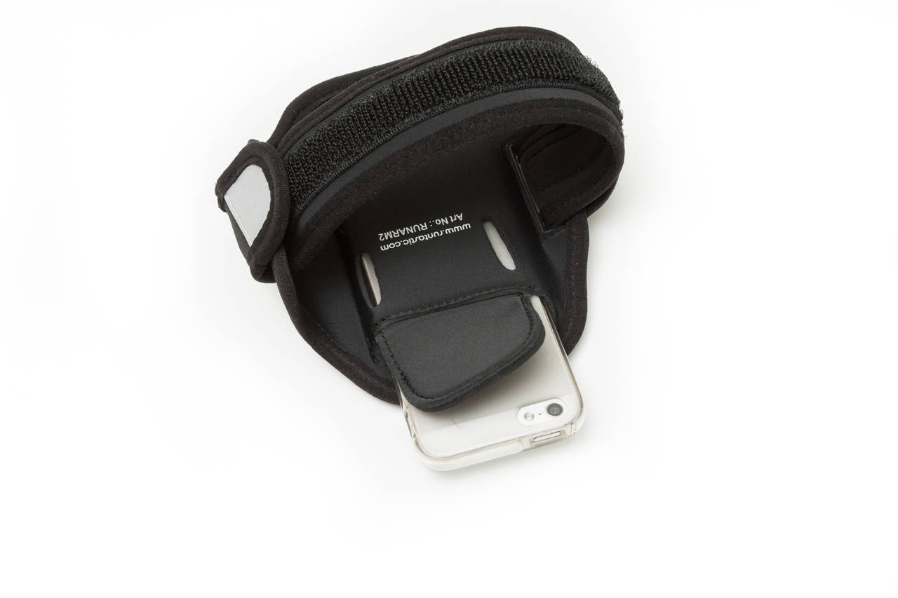 Als weitere Zugabe hat uns runtastic freundlicherweise ein Sports Armband zum Testen gegeben. Solche Oberarmtaschen kommen meist beim Joggern zum Einsatz. Das Smartphone soll so schnell erreichbar sein und voll bedienbar sein, während man eine Runde rennt. Normalerweise hat man ja beim Joggen keine Zeit, das Smartphone aus der Hosentasche zu ziehen. Die Tasche besitzt eine Neoprenaußenschicht, um das Eindringen von Schweiß zu verhindern, der natürlich beim Sport entsteht. Aber auch für einen Spritzwasserschutz wird genau dadurch gesorgt. Die Größe wurde vom Hersteller universal ausgelegt, so dass unterschiedliche Modelle hinein passen. Maximal 15 Zentimeter hoch und 7,5 Zentimeter breit und 1,5 Zentimeter dick darf das Handy sein, damit es noch hinein passt. Im Test nutzen wir ein iPhone 5, was problemlos den Weg in die Hülle fand. Selbst mit Silikonhülle ging es gerade noch so hinein.