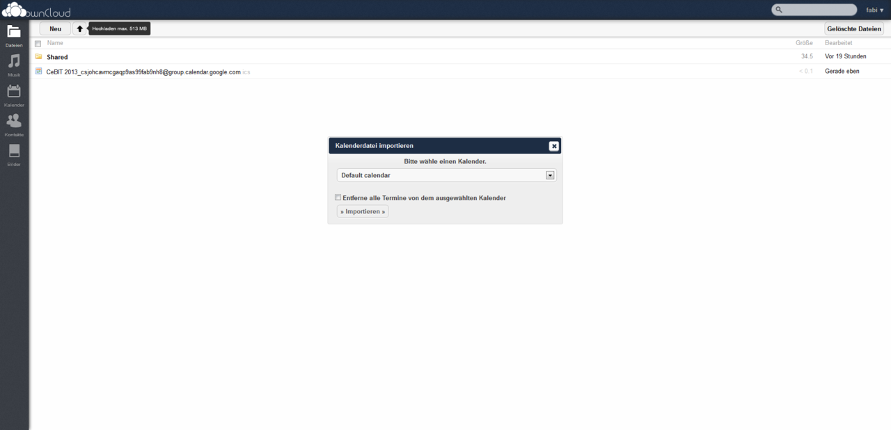 Auch die Einträge des Google-Kalenders lassen sich auf ähnliche Weise exportieren. Wählt in eurem Google-Account den rechts oben befindlichen Würfel aus und klickt dort auf Kalender. Jetzt öffnet sich ein neuer Tab, an dem ihr euch erneut mit eurem Google-Account anmelden müsst. Hat alles funktioniert, erscheint der Kalender auf dem Bildschirm. Nun müsst ihr das Zahnrad anwählen die Option "Einstellungen" anklicken. Im Reiter "Kalender" kann dieser nun im ICS-Format exportiert werden. Der Import der Kalender ist extrem komfortabel, da diese einfach nur im Hauptverzeichnis der ownCloud-Oberfläche hochgeladen werden müssen. OwnCloud erkennt nun automatisch, dass es sich um Kalenderinträge handelt und fügt diese dem Reiter "Kalender" hinzu.